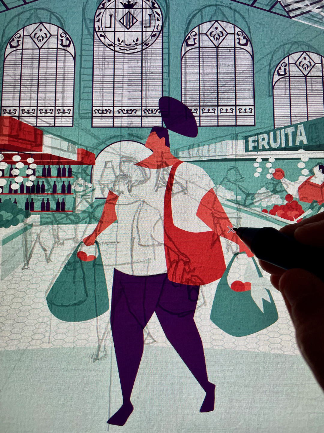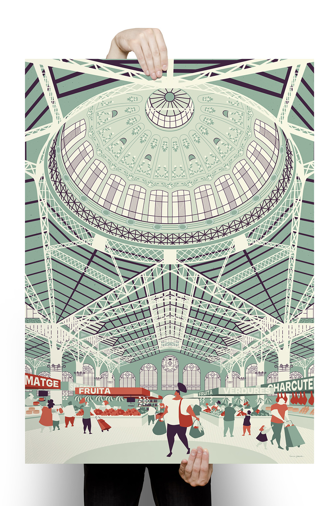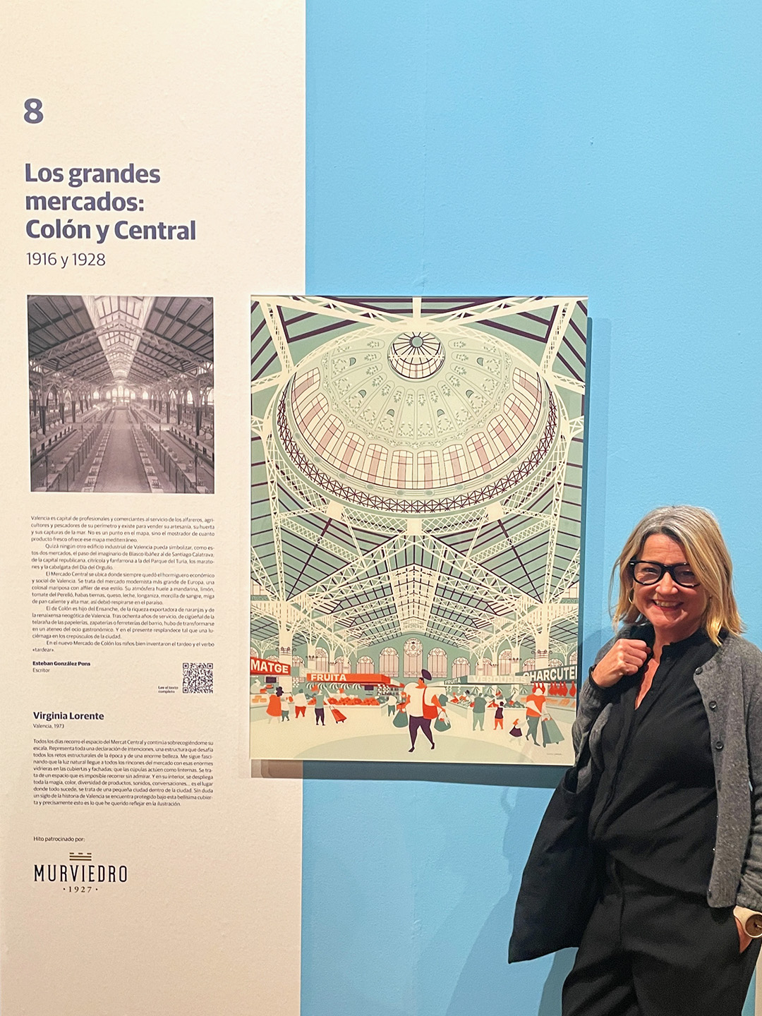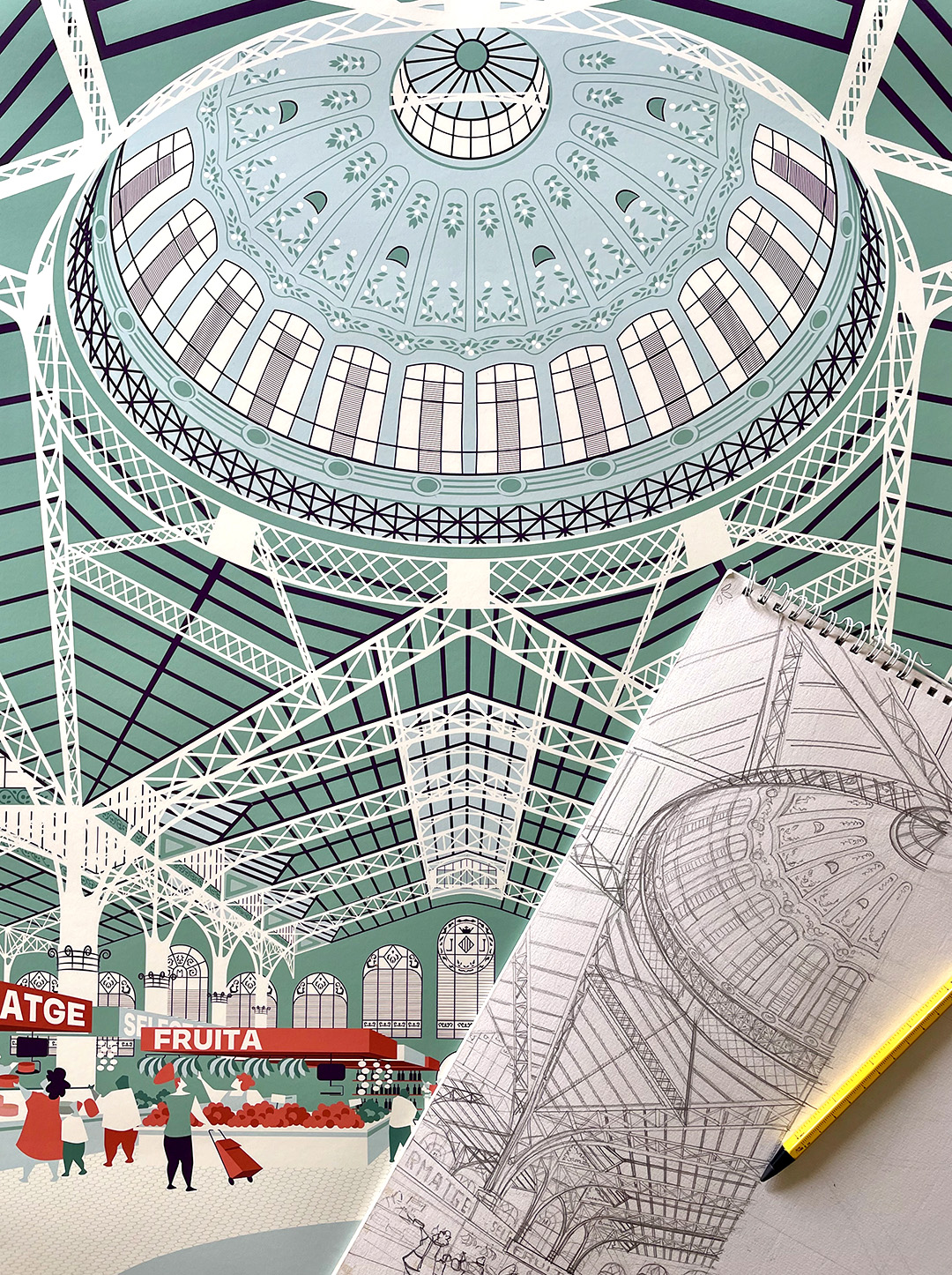Un segle de la història de València es troba protegit sota aquesta bellíssima cúpula; una ciutat dins de la ciutat on conviuen noves parades amb unes altres que ja compleixen cinc generacions i precisament això és el que he volgut reflectir en la il·lustració, representar la magnitud d’aquest espai cobert, incommensurable i bell.